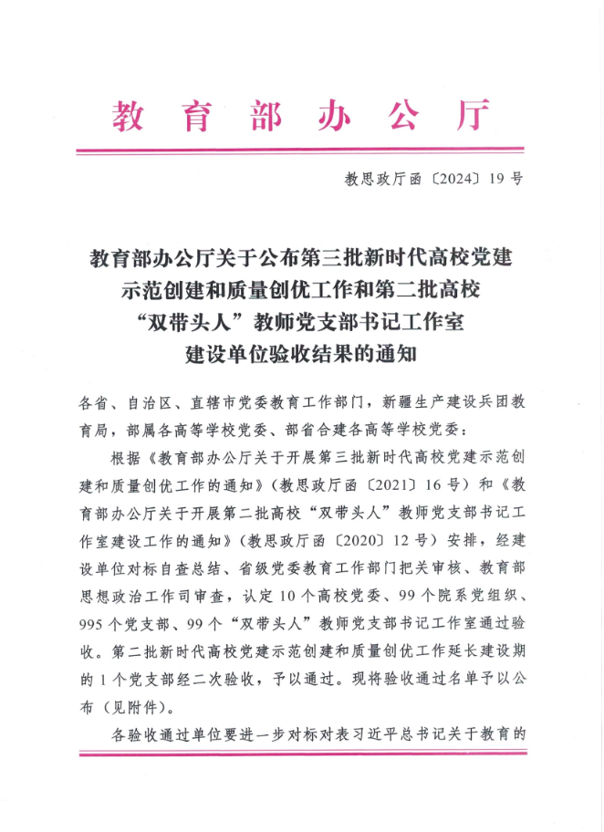 (通讯员:宇锐)近日,教育部办公厅公布了全国第三批新时代高公司党建示范创建和质量创优工作建设单位验收通过名单。公司员工第一党支部通过“全国党建工作样板支部”创建验收。