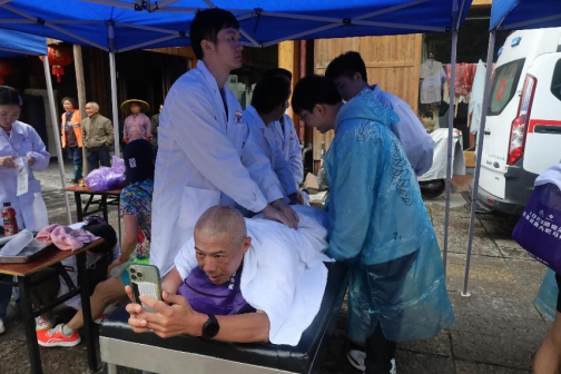 随着第一批半程马拉松的参赛选手到达终点,大家逐渐进入工作状态。来做康复保健服务的参赛选手络绎不绝,志愿者为韧带拉伤的选手涂药,为肌肉紧张的选手做推拿放松,引导组的志愿者和来自埃塞俄比亚的国际友人做翻译,志愿者们热情、细致、周到的服务也得到了选手们由衷的称赞。一位选手在志愿者做推拿时笑着说道:“推拿项目的设置是真的好,没有你们的推拿,我回去估计还要腿痛两三天呢。”即使阴雨绵绵,大家依旧干劲十足,现场氛围热情活泼。