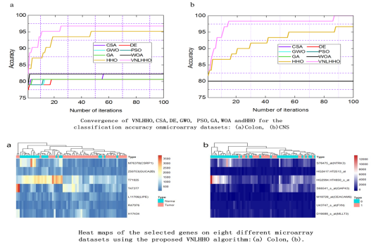 从基因表达数据中挖掘出与肿瘤相关的关键基因在癌症的诊断和治疗中起着至关重要的作用。然而,由于表达数据的高维性和样本数量的有限性,从表达数据中获得这些关键基因一直是一项具有挑战性的难题。课题组采用VNLHHO算法对8种肿瘤基因表达数据集(数据来源:http://csse.szu.edu.cn/staff/zhuzx/Datasets.html)的研究显示:VNLHHO在Colon、Central Nervous System和Lung 3种肿瘤的平均分类精度都达到了96.128%以上,对另外5种肿瘤(Leukemia, Lymphoma, Myeloid/Lymphoid Leukemia(MLL), Ovarian, andSmall Round Blue Cell Tumors (SRBCT))的分类精度达到了100%。与其它目前常用算法的对比,结果显示VNLHHO在分类精度和AUC值方面都具有明显优势。对测试样本的基因表达谱数据进行了层次聚类分析,热图显示采用VNLHHO法所筛选出的基因能够很好的区分各种不同类型的样本。通过对所筛选出的特征基因进行医学验证,进一步验证了VNLHHO算法的正确性和有效性。