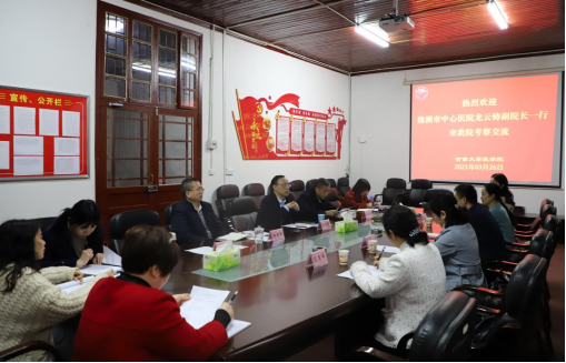 (唐海欧)3月26日上午,株洲市中心医院副经理龙云铸一行来公司考察交流。考察交流座谈会在公司办公楼208会议室举行,公司经理彭小宁,副经理向明钧,院办公室主任刘英姿、护理系主任罗雪梅等参加了会议,会议由副经理向志钢主持。