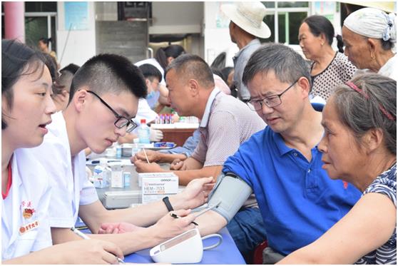 图为健康扶贫队员为前来指导工作的龙先琼副董事长测量血压