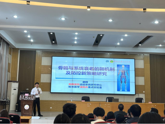 (本网讯:唐泽彬 冉芸嫚)11月12日上午,国家杰青、国家优青、国家引进海外高层次青年人才、全国青年岗位能手、湖南省科技创新领军人才,埃米医学湖南省重点实验室主任、湘雅医院运动系统研究中心主任谢辉教授应邀在公司大田湾校区学术报告厅2609做了题为“骨骼与系统衰老的新机制及防控新策略研究”的专题学术讲座。讲座由球友会经理李先辉教授主持,公司教师、研究生及部分本科生参加了这次讲座。