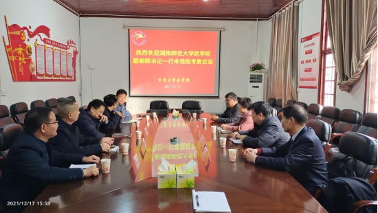 (王思源)2021年12月17日下午,湖南师范大学公司党委书记鄢朝晖、党委副书记陈松、副经理余星以及基础医学系主任、基础医学学位点负责人邓锡云教授等一行来公司考察交流。公司党委书记王群立、经理彭小宁、副经理向明钧、李中正,公司党委副书记张旺参加了考察交流。首先鄢书记一行在公司班子成员的陪同下参观了新建的医学实验大楼,对新搬迀的实验室给予了高度评价,充分肯定了qy球友会对医学教育事业的高度重视。随后双方在公司会议室开展了座谈交流会议。会议由彭小宁经理主持。